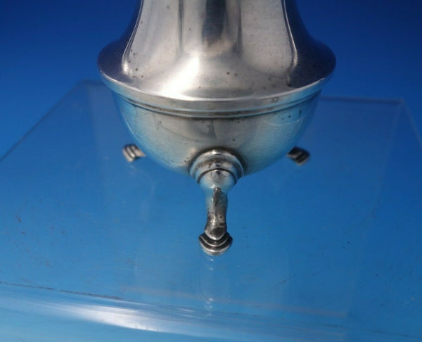 Superb sterling silver heavy gadroon style salt and pepper shaker pair marked #2964 (maker unknown). These pieces feature feet and are an early American reproduction. The shakers measure 5" tall x 2" and in total weigh 6.4 troy ounces. They are not monogrammed and are in good vintage condition. Terrific!
