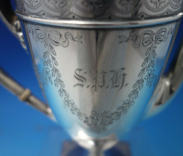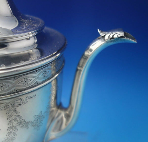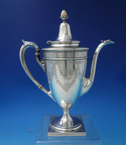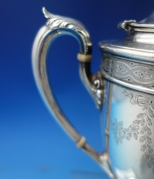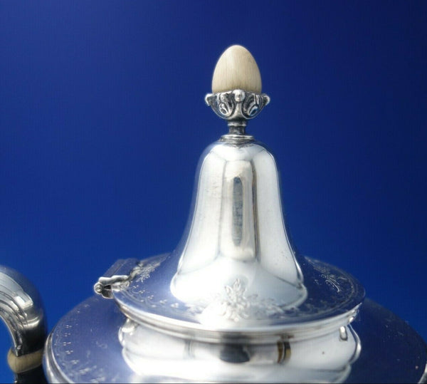 Fabulous Chatham Engraved by Durgin sterling silver three-piece demitasse coffee set marked #280 featuring faux ivory finials. This set includes: