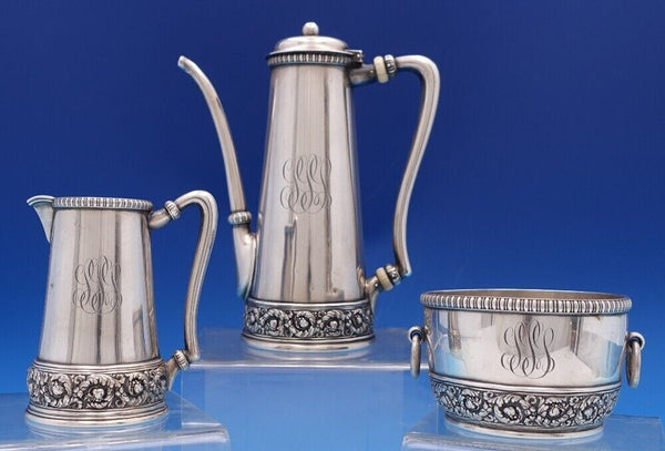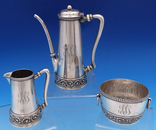 Exquisite Tiffany Co. sterling silver 3-piece Chocolate Set. The pieces have "T" date mark, circa 1892-1902. The set coordinates beautifully with the Olympian pattern. The set includes: