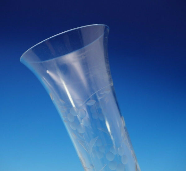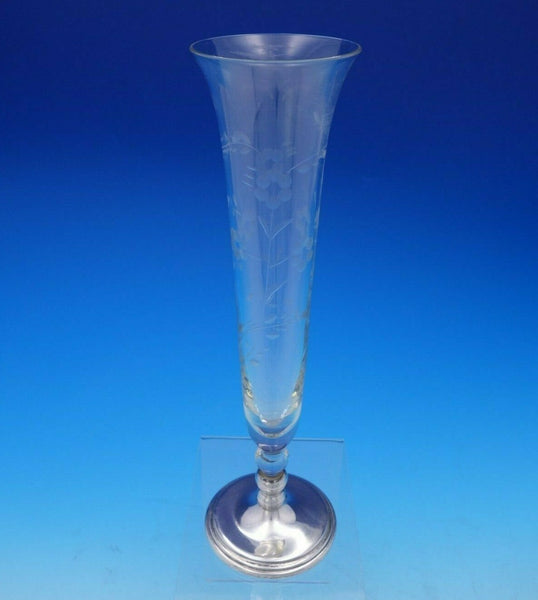 Beautiful vase with etched glass and sterling silver base (maker unknown; only marked sterling). The vase measures 10 3/4" tall x 3 1/8" in diameter. It is not monogrammed and is in excellent condition. Pretty!