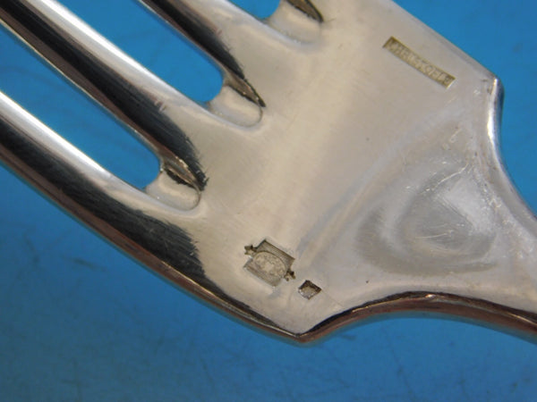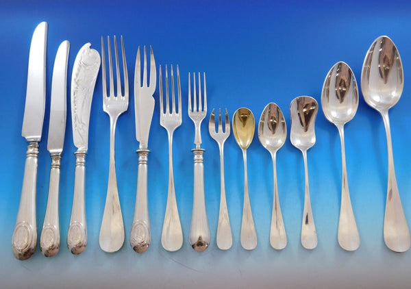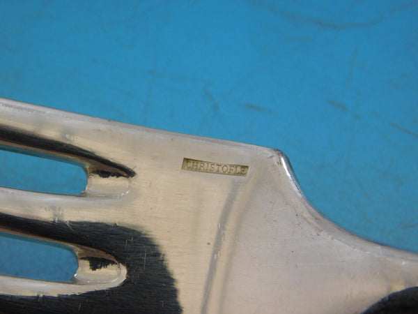 Monumental Baguette / Fidelio by Christofle France estate Silverplate Flatware set - 199 pieces. This set includes:12 Dinner Size Knives, 10"24 Dinner Size Forks, 8 3/8"12 Luncheon Knives, 9"12 Luncheon Forks, 7 1/4"12 Teaspoons, 5 5/8"12 Place Soup Spoon, 7 1/4"12 Cream Soup Spoons, 5 7/8"12 Oyster Forks, 5 1/2"12 Fish Forks, hollow handle, brite-cut, 7"12 Fish Knives, hollow handle, dolphin shape, brite-cut, 8 7/8"12 Egg Spoons, 5 1/2"12 Dinner Spoons, 8 1/2"12 Melon Knife / Fork, hollow handle, 8 1/2"2 Gravy Ladle, 8"2 Serving Spoons, 9"1 Fish Serving Fork, hollow handle, brite-cut, 9 5/8"1 Sugar Sifter, pierced with leaves, 6 1/2"1 Pastry Server, hollow handle, brite-cut, 7 3/4"1 Tomato Server / Spoon, 8 1/2"1 Platter Spoon, 10 3/4"1 Pie Server, brite-cut, 12"1 Cake Knife, hollow handle, 10 1/2"1 Pea Spoon, 8 1/2"1 Jelly Spoon, 6 3/8"1 Roast Carving Fork, 11 1/4"1 Asparagus Server, hooded, brite-cut, 10"1 Grape Shears, 6 1/2"1 Nut Cracker, 6 5/8"1 Ice Tong, 6 3/4"1 Salad Serving Set, with bone, 11 1/4'1 Soup Ladle, 12 1/2"1 Ice Cream Slice, dolphin shape, 11 1/2"1 Sardine Fork, 6"1 Lamb Shank Holder, 8"1 Mustard Ladle, 4 3/4"6 Master Salt Spoons, 3 5/8"Includes vintage storage drawers (not all pieces have spots).