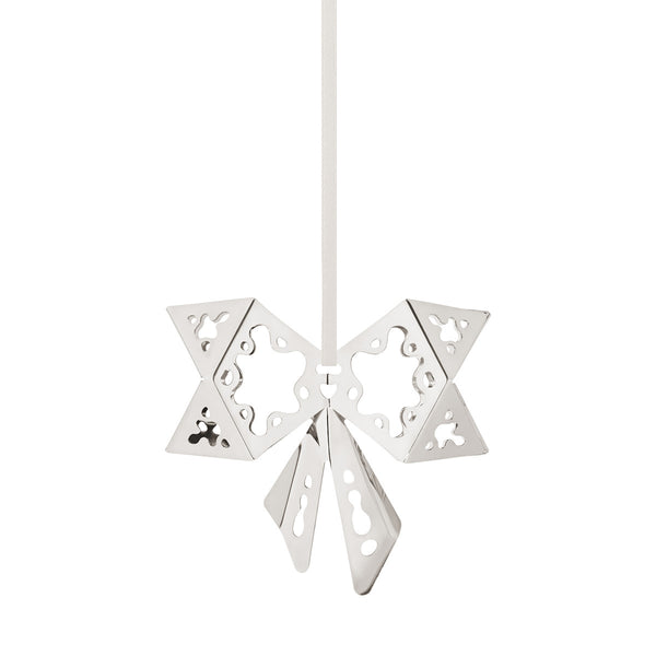 This elegant Christmas decoration by Sanne Lund Traberg is inspired by the designer's childhood memories. Featuring lace-inspired detailing and boasting a simple and light silhouette, this bow plated in palladium comes with the 2022 special ribbon in off-white as well as the classic red ribbon. Adding a cozy glow to your home at the best time of year.