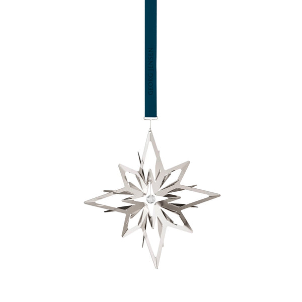 The 2024 edition of the annual Georg Jensen Christmas Movile features a radiant star designed by long-time collaborator Sanne Lund Traberg. The pendant hangs from a festive red ribbon and features a small zirconia ball at its centre for an extra touch of sparkle. Its silver, palladium-plated form is inspired by the shimmering quilt of stars that light up the night sky on a dark, wintry evening.