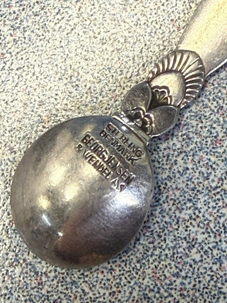 Sterling silver Salt Spoon with Wendel mark 2 1/8" in the pattern Cactus by Georg Jensen. It is not monogrammed and is in excellent condition.