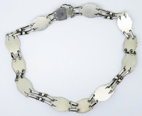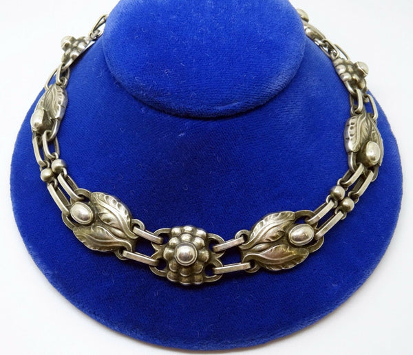 Impressive Georg Jensen sterling necklace #1 with leaves and berries. The necklace measures 15 1/2" long. It weighs 37.1 dwt., and the necklace dates from the 1950's. There is also a matching pair of earrings (SKU#J3334) that would go perfectly with this piece. Inventory#NZ3503.