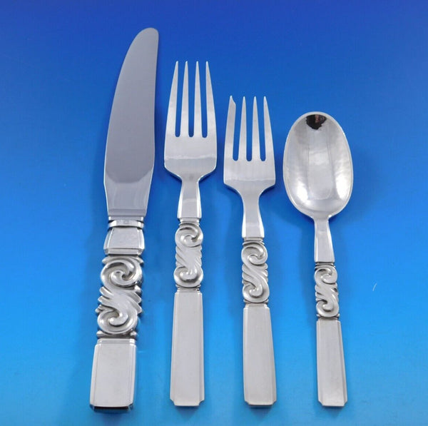 Exquisite Dinner Size Scroll by Georg Jensen Danish sterling silver Flatware set - 106 pieces. This set includes: