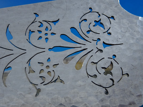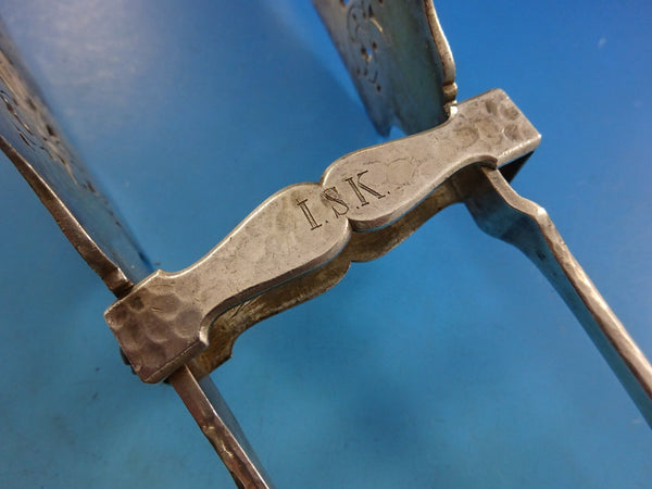 Superb large Japonesque sterling silver yoked Asparagus Serving Tong, beautifully hand hammered and pierced with intricate flower and leaves on the back and front of the rectangular tongs. Applied copper berries and applied gold and copper leaves and copper branch decorate the handle on both sides.