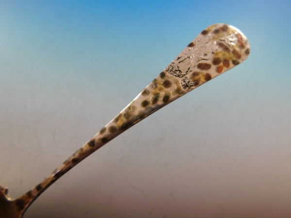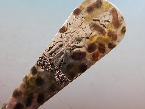 Captivating sterling silver Sugar Sifter measuring 8" with mixed metals design similar to Cairo by Gorham, although these metals are gilded, not inlaid metals. This beautiful piece has gilt mixed metals through out the handle and features an applied Japanesque scene of a man and bird. The bowl of the spoon is gold-washed and has very fine piercings. It is not monogrammed and is in excellent condition.