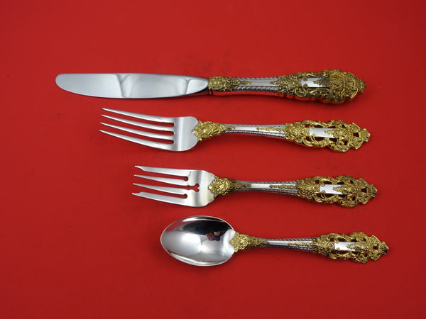 Sterling silver Dinner 4-piece place Setting in the pattern Crown Baroque Gold by Gorham. It is not monogrammed and is in excellent condition.