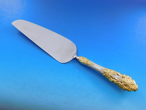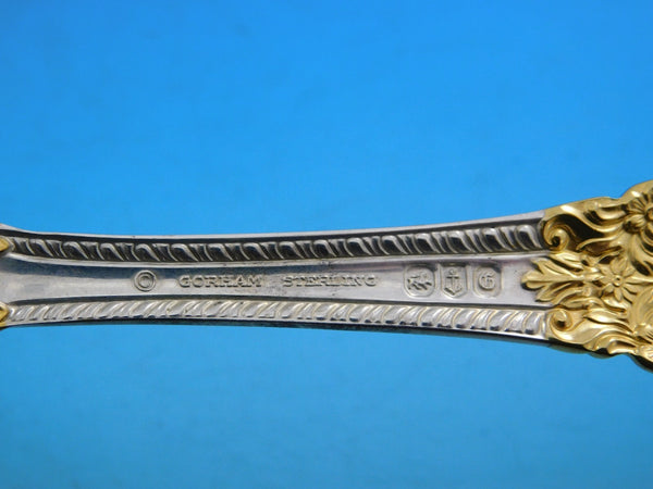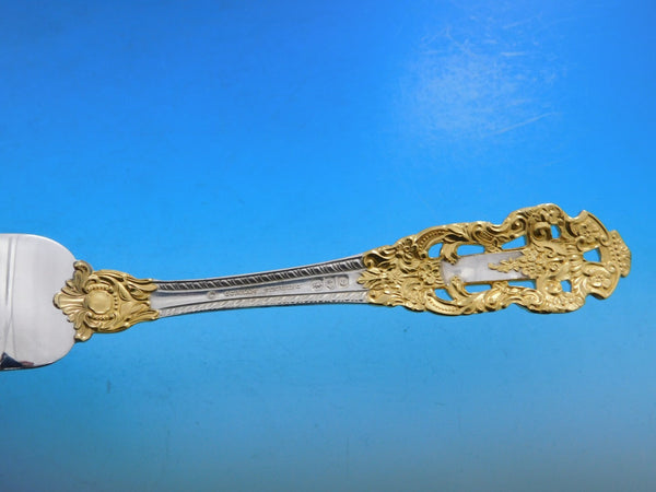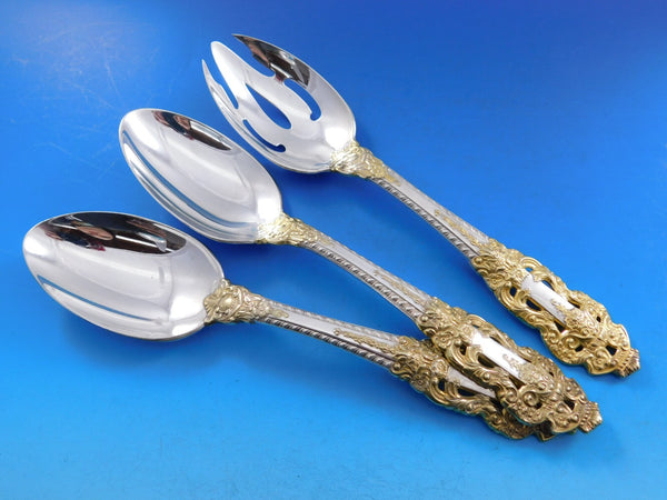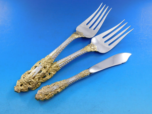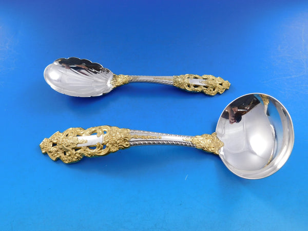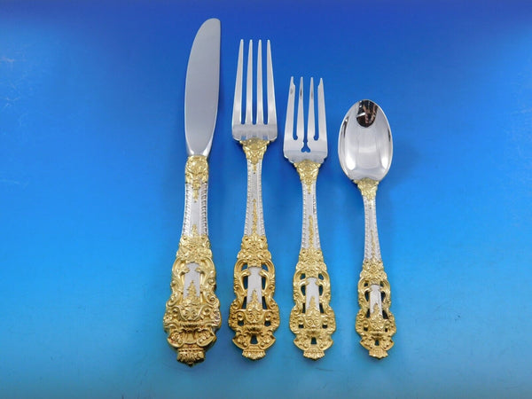 Monumental Dinner size Golden Crown Baroque by Gorham sterling silver with gold accent Flatware set - 105 pieces. This pattern is large, heavy, and impressive. This set includes: