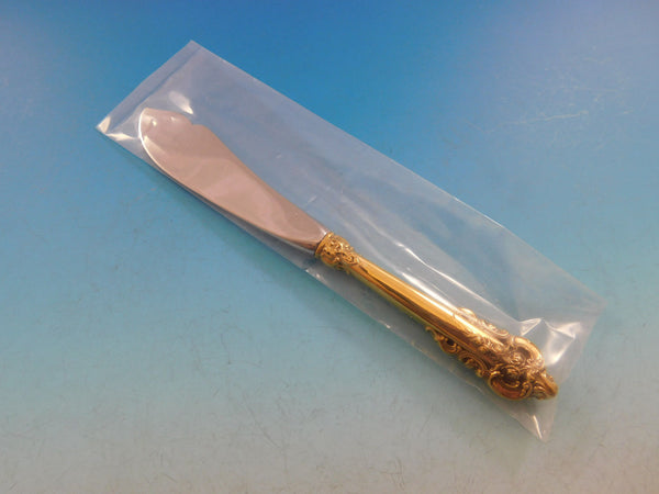 Beautiful Vermeil (completely gold-washed) GRANDE BAROQUE BY WALLACE sterling silver Flatware set - 35 Pieces. This set includes:8 REGULAR KNIVES, 8 7/8" 8 REGULAR FORKS, 7 1/2" 8 SALAD FORKS, 6 1/2" 8 TEASPOONS, 6 1/4" 1 SERVING SPOON, 8 3/4" 1 SUGAR SPOON, 6 1/4" 1 HOLLOW HANDLE MASTER BUTTER, 6 3/4" Includes bonus brand new storage chest - styles vary.