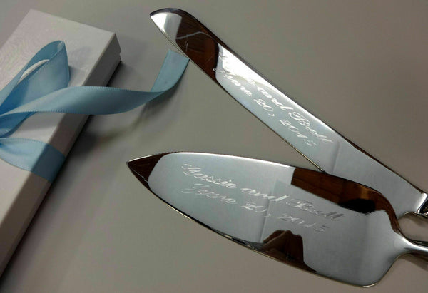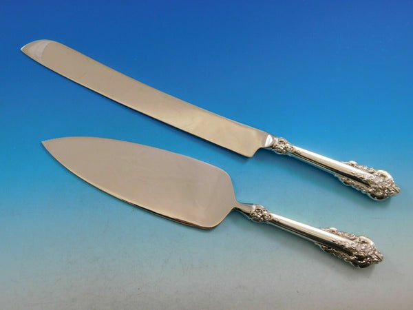 The cake knife and server set have original Grande Baroque by Wallace sterling silver handle and brand new stainless blades. The blades can be engraved with the bride and groom's names and wedding date.