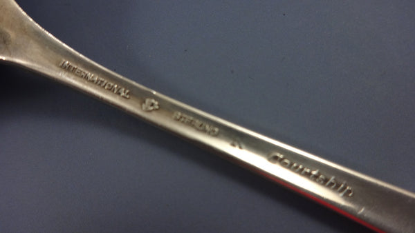 Lovely COURTSHIP BY INTERNATIONAL sterling silver Flatware set - 54 Pieces. This set includes:8 KNIVES, 9" 8 FORKS, 7 1/4" 8 SALAD FORKS, 6 3/8" 8 TEASPOONS, 6" 8 CREAM SOUP SPOONS, 6 3/8" 8 FLAT HANDLE BUTTER SPREADERS, 5 5/8" 1 SUGAR TONG, 4" 1 GRAVY LADLE, 6 1/2" 1 SERVING SPOON, 8 1/2" 1 COLD MEAT FORK, 9" 1 SUGAR SPOON, 5 7/8" 1 FLAT HANDLE MASTER BUTTER KNIFE, 7 1/8"  Includes bonus brand new storage chest - styles vary.