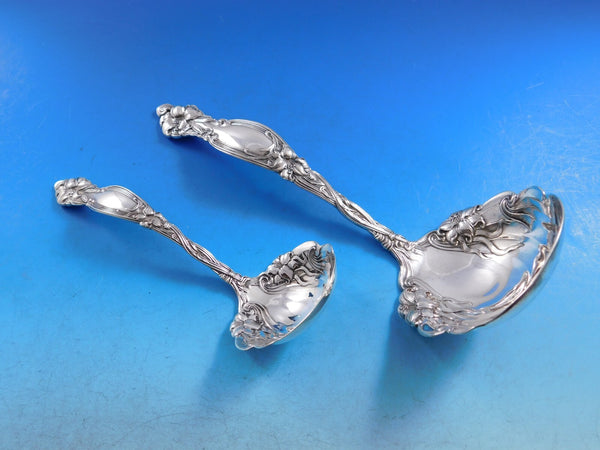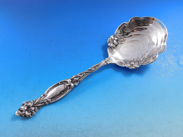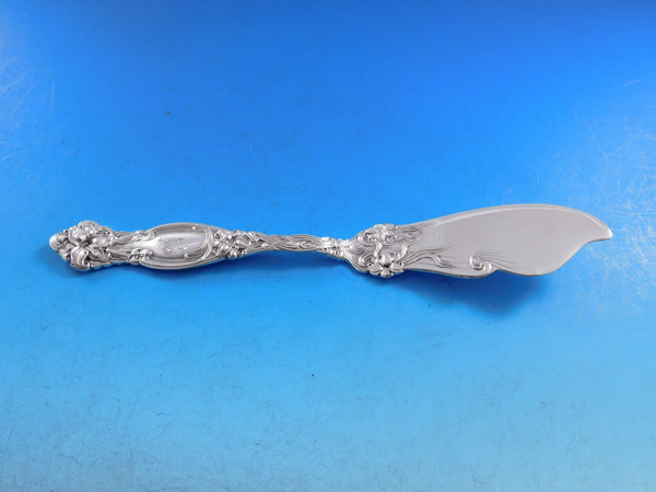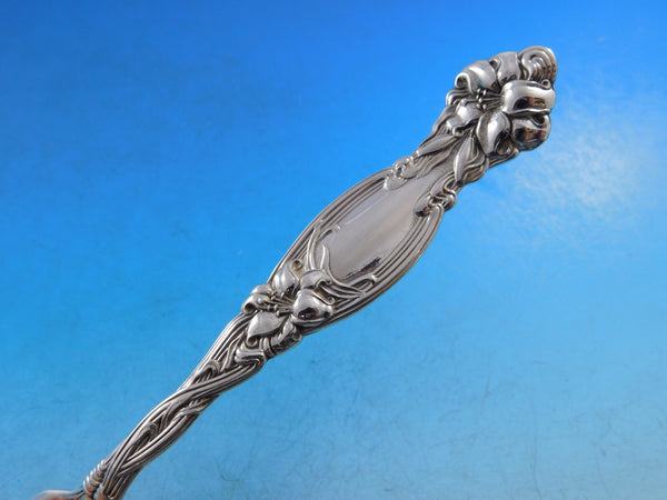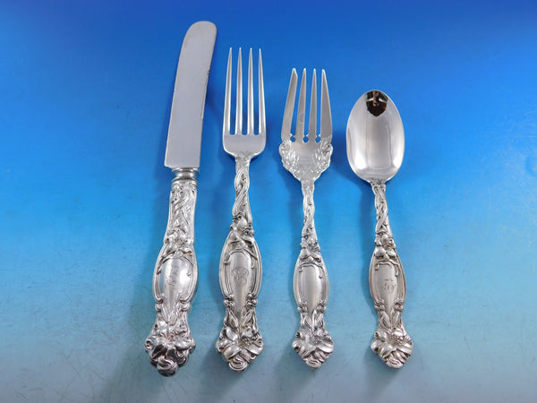 Gorgeous Dinner Luncheon Size Frontenac by International sterling silver Flatware set - 102 pieces. This pattern was introduced in the year 1903 and features beautiful Art Nouveau lily flowers with leaf detailing that flows down the handle, with more flowers on the shoulders of some pieces including the butter spreaders and salad forks. This set includes:
