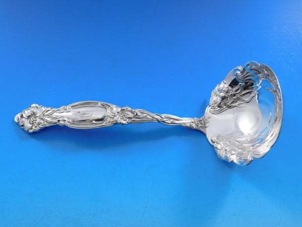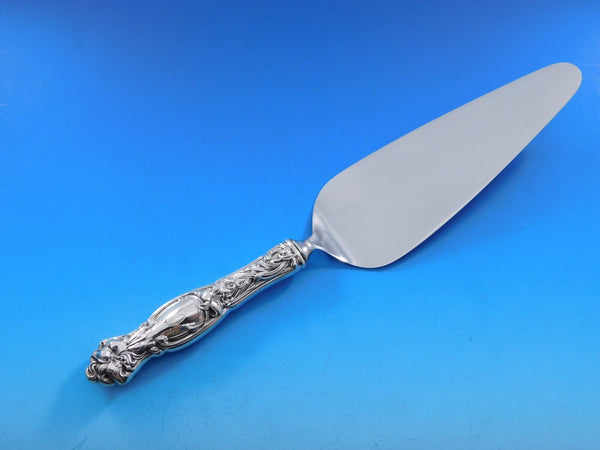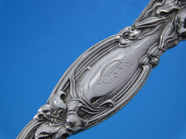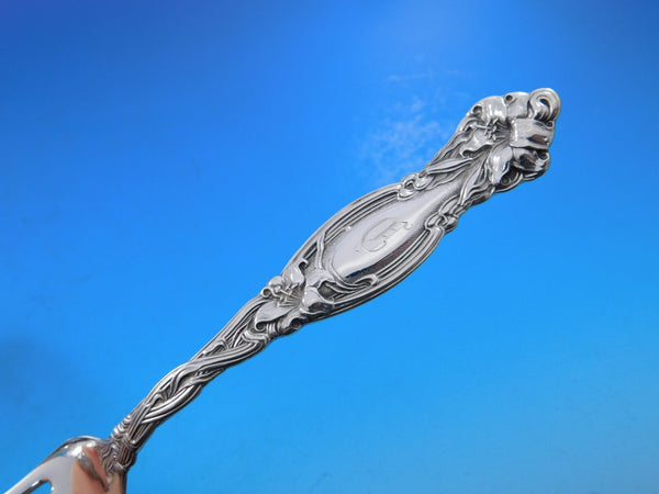 Frontenac by International sterling silver Flatware set - 61 pieces. This pattern was introduced in the year 1903 and features beautiful Art Nouveau lily flowers with leaf detailing that flows down the handle, with more flowers on the shoulders of some pieces including the salad forks and some of the serving pieces. This set includes: