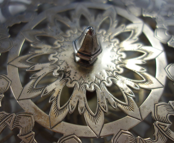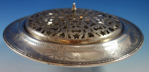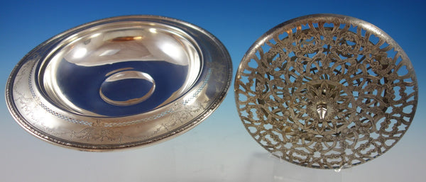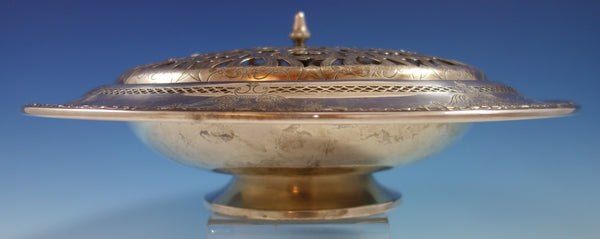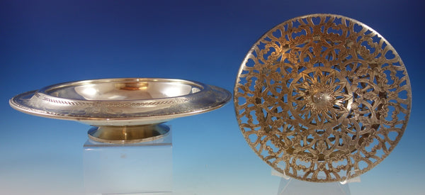 Beautiful International sterling silver flower arranger with silverplate top (pierced frog insert). The piece is marked #V32-1, it measures 12 1/2" in diameter x 4 1/2", and weighs (without top) 24.5 troy ounces. It is not monogrammed. This piece is in excellent condition with the silverplate top in very good vintage condition with minor surface scratches as expected with age. Wonderful!