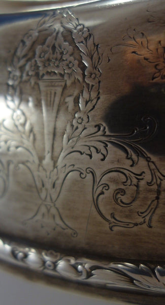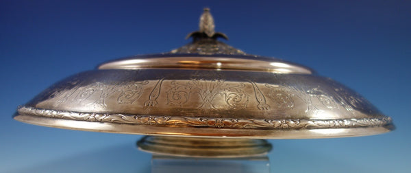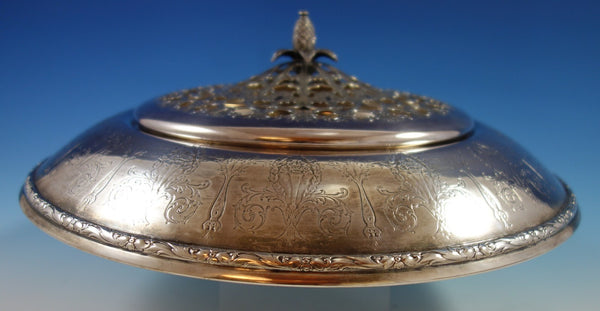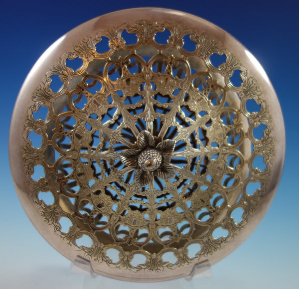 Gorgeous Orange Blossom by International sterling silver flower arranger with silverplate frog. The piece is marked #V75, measures 14" in diameter x 4 1/2", and weighs (without frog) 29.3 troy ounces. It is not monogrammed. This piece is in excellent condition with the silverplate top in good vintage condition with minor surface scratches as expected with age. Brilliant!
