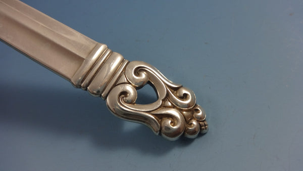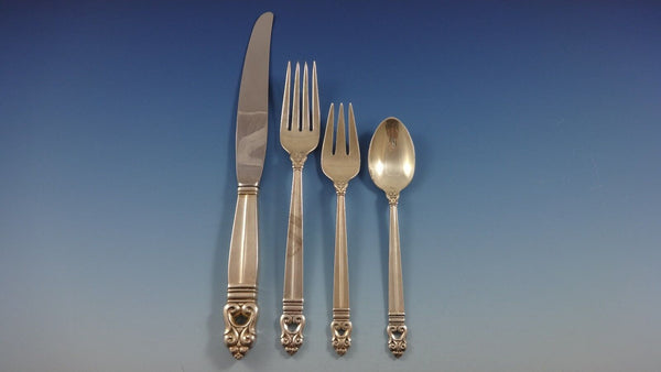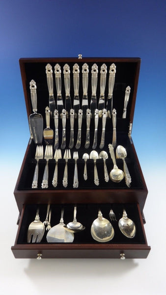 ROYAL DANISH BY INTERNATIONAL DINNER SIZE sterling silver Flatware set - 77 pieces. This set is dinner size with TONS of serving pieces! This set includes:8 DINNER SIZE KNIVES, 9 3/4" 8 DINNER SIZE FORKS, 7 3/4" 8 SALAD FORKS, 6 3/8" 8 TEASPOONS, 6 1/8" 8 PLACE SOUP SPOONS, 6 3/4" 8 HOLLOW HANDLE BUTTER SPREADERS ALL-STERLING, 6" 8 COCKTAIL FORKS, 5 1/2" 8 DEMITASSE SPOONS, 4 1/8" 1 GRAVY LADLE, 6 1/2" 1 SERVING SPOON, 8 1/2" 1 PIERCED SERVING SPOON, ORIGINAL, 8 1/2" 1 COLD MEAT FORK, 7 3/4" 1 HOLLOW HANDLE MASTER BUTTER KNIFE, 7" 1 PICKLE FORK, 5 7/8" 1 TOMATO SERVER, NOT PIERCED, 7 7/8" 1 PIE SERVER W/STAINLESS ROUNDED BLADE, 10 3/8" 1 SAUCE LADLE, 5 1/2" 1 BERRY SPOON, 9 1/8" 1 CHEESE SERVER W/STAINLESS BLADE, 6 1/4" 1 LARGE COLD MEAT FORK, 8 7/8" 1 SUGAR TONGS, 4" Includes bonus brand new storage chest - styles vary.