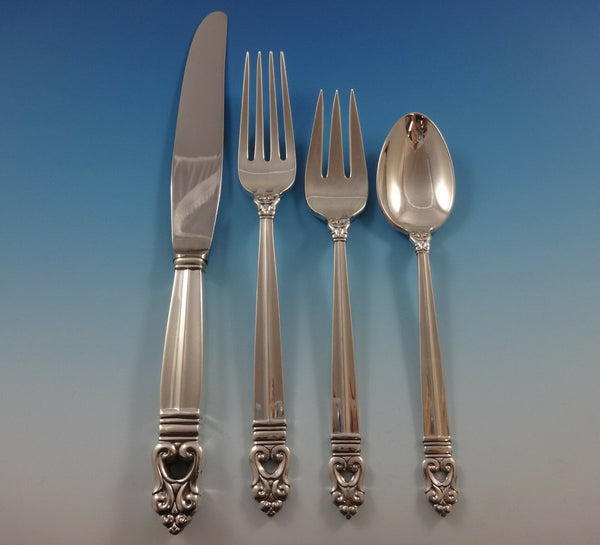 ROYAL DANISH BY INTERNATIONAL sterling silver Flatware set - 86 Pieces. This set includes:12 KNIVES, 9" 12 FORKS, 7 1/4" 12 SALAD FORKS, 6 3/8" 12 TEASPOONS, 6" 12 CREAM SOUP SPOONS, 6 1/2" 12 HOLLOW HANDLE BUTTER SPREADERS, ALL-STERLING, 6" 12 COCKTAIL FORKS, 5 1/2" 1 SUGAR SPOON, 6" 1 SALAD SERVING FORK, 9 1/8" Includes bonus brand new storage chest - styles vary.