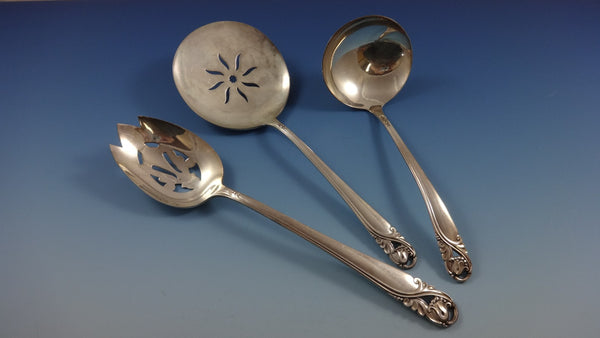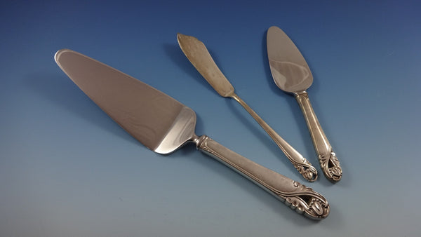 8 KNIVES, 9 1/4" 8 FORKS, 7 1/4" 8 SALAD FORKS, 6 1/2" 8 TEASPOONS, 6" 8 HOLLOW HANDLE BUTTER SPREADERS, 5 3/4" 1 GRAVY LADLE, 6 1/4" 1 PIERCED SERVING SPOON, 8 1/2" 1 FLAT HANDLE MASTER BUTTER KNIFE, 7 1/4" 1 PIE SERVER W/STAINLESS BLADE, 10 3/8" 1 CHEESE SERVER W/STAINLESS BLADE, 6 1/4" 1 TOMATO SERVER, 8" Includes bonus brand new storage chest - styles vary.