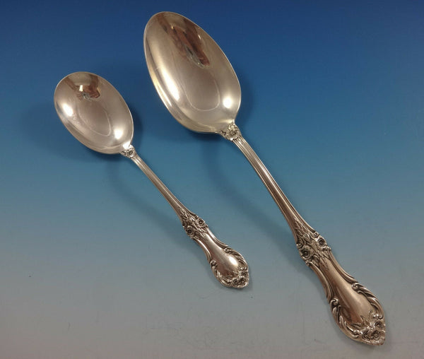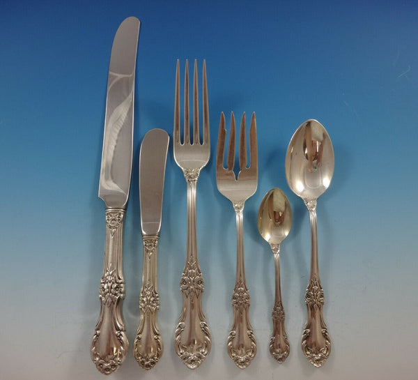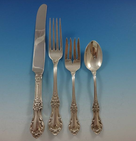 12 KNIVES, 9 1/8" 12 FORKS, 7 1/4" 12 SALAD FORKS, 6" 12 TEASPOONS, 5 7/8" 12 HOLLOW HANDLE BUTTER SPREADERS, 5 7/8" 12 DEMITASSE SPOONS, 4 1/8" 1 GRAVY LADLE, 6 3/8" 1 SERVING SPOON, 8 1/4" 1 SMALL COLD MEAT FORK, 7 3/4" 1 LARGE COLD MEAT FORK, 8 3/4" 1 SUGAR SPOON, 6 1/8" 1 FLAT HANDLE MASTER BUTTER, 7 1/8" 1 LEMON FORK, LONG HANDLE, 5 3/4" 1 PIE SERVER W/STAINLESS BLADE, 11 1/4" 1 NUT SPOON, 4 5/8" 1 JELLY SERVER, 6 1/4" Includes bonus brand new storage chest - styles vary.