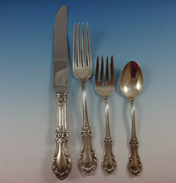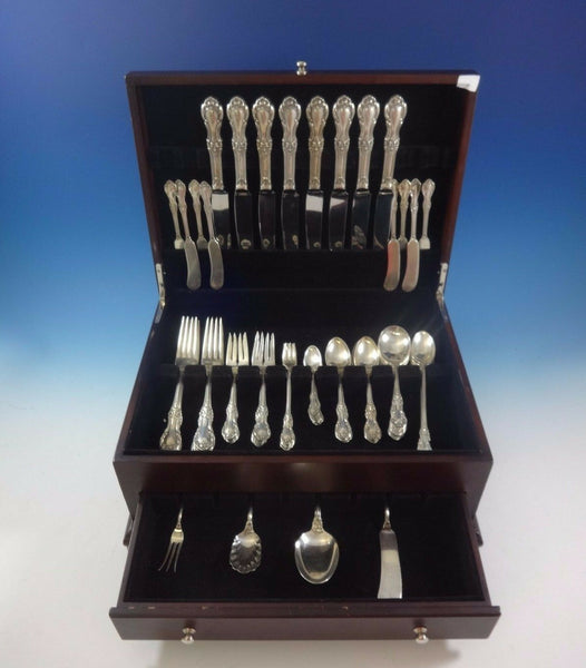 8 DINNER SIZE KNIVES, 9 1/2" 8 DINNER SIZE FORKS, 7 5/8" 8 SALAD FORKS, 6" 8 TEASPOONS, 5 7/8" 8 CREAM SOUP SPOONS, 6" 8 FLAT HANDLE BUTTER SPREADERS, 5 1/2" 8 COCKTAIL FORKS, 5 1/2" 8 ICED TEA SPOONS, 7 3/8" 8 DEMITASSE SPOONS, 4 1/8" 1 SERVING SPOON, 8 1/4" 1 SUGAR SPOON, 6 1/8" 1 FLAT HANDLE MASTER BUTTER, 7 1/4" 1 LEMON FORK, 4 5/8" Includes bonus brand new storage chest - styles vary.