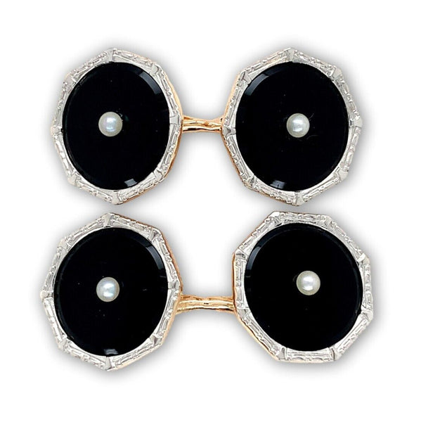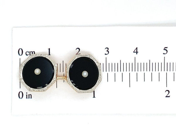 Platinum topped 14k yellow gold pair of cufflinks with black onyx and cultured pearls. The platinum top has gillouche engraving. The cufflink single circle measures 1/2" in diameter, and the link with two circles measures 1 1/8" long. The black onyx disk measures about 10mm, and the pearl measures about 2.6mm. The pair weighs 3.55 dwt. They date from the 1920s. Wow!