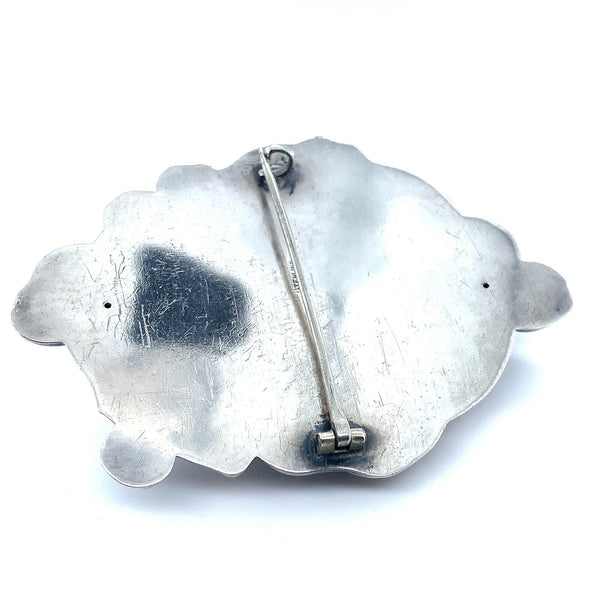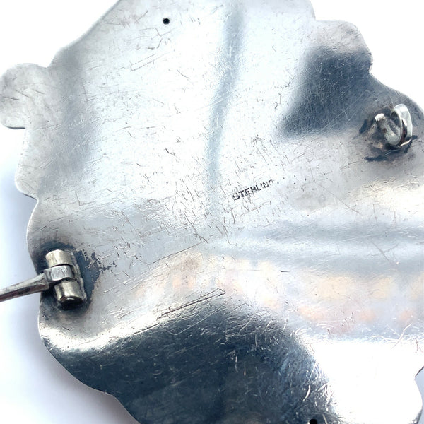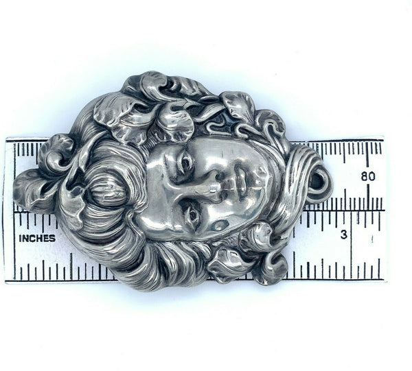Art Nouveau large sterling pin featuring a woman with irises. The pin measures about 2 3/4"-3" long and 2" wide. The pin weighs 13.3 dwt., and dates from about 1900. Note: There are a few dings and dents, being offered as-is. Lovely piece.
