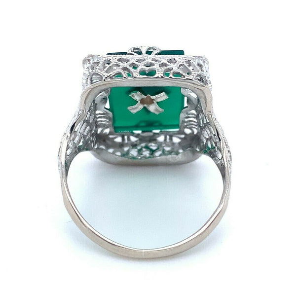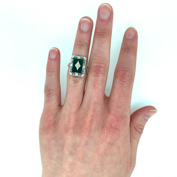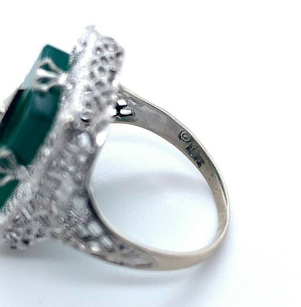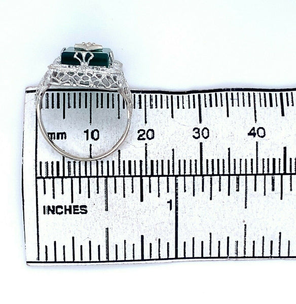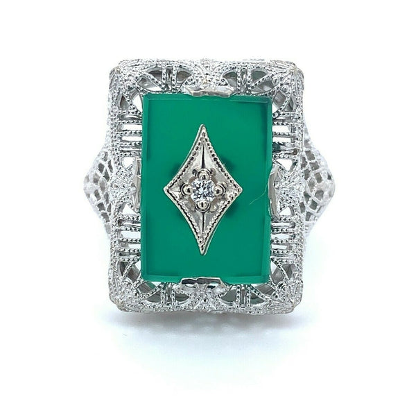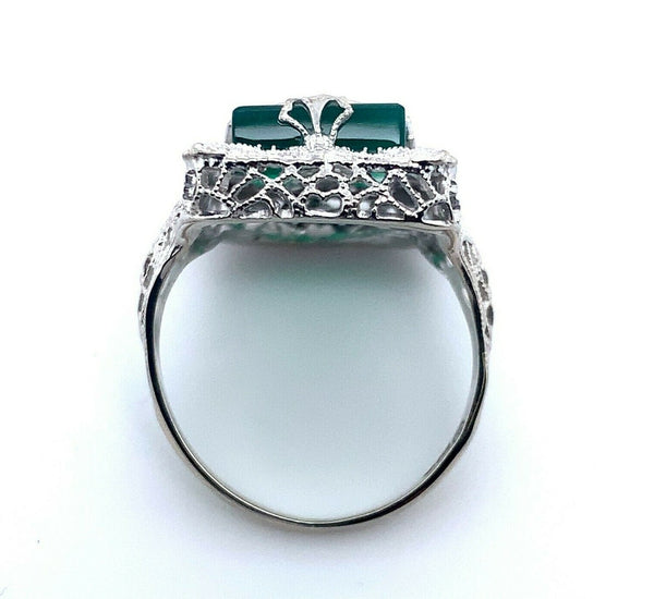 Art Deco 10k white gold filigree ring featuring a green onyx or chrysoprase panel. The green onyx measures about 12.5mm x 8.5mm and is set with a small round diamond measuring about 1.7mm.
