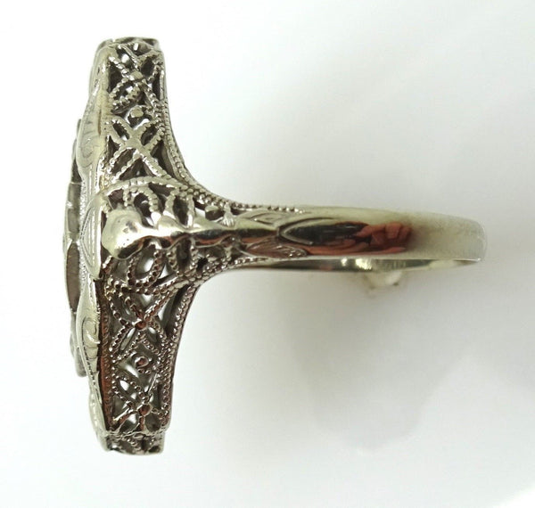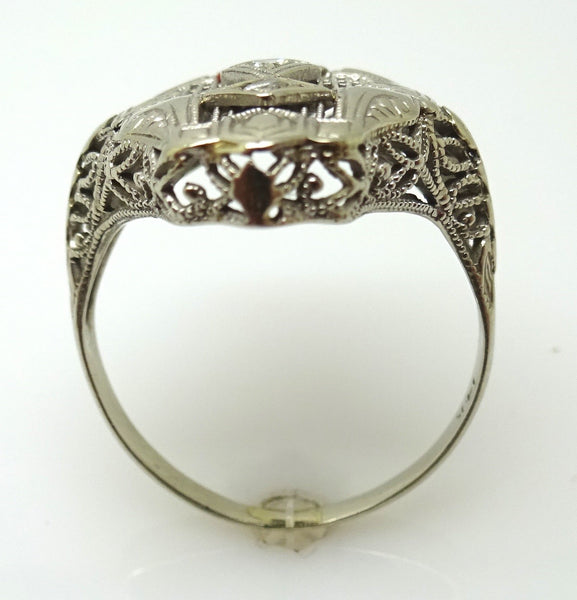 Art Deco 14k White Gold Three Genuine Natural Diamond Filigree Ring (#J3809)