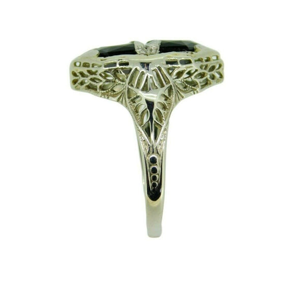 Art Deco 14k White Gold Specialty Cut Genuine Natural Onyx Filigree Ring (#J0910)