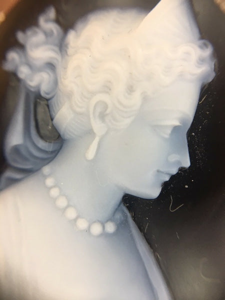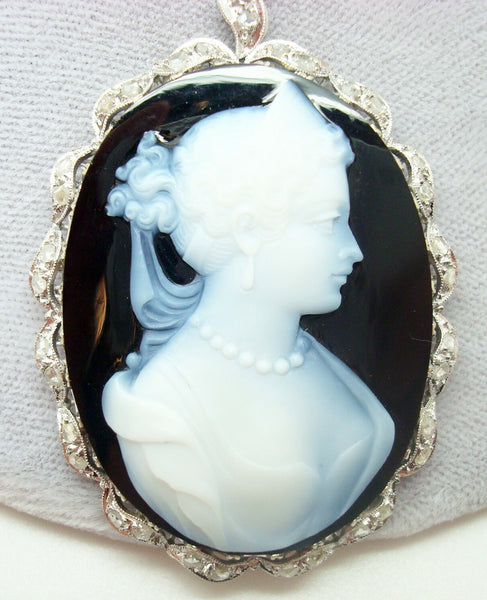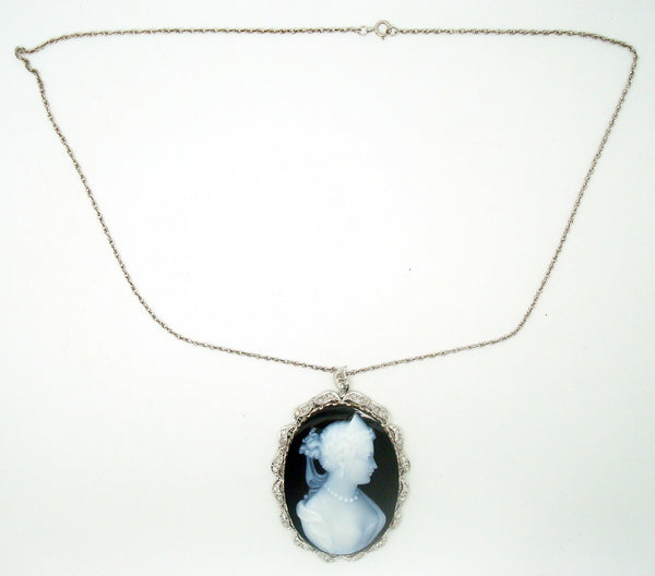 18k white gold black and white hard stone cameo pendant. It is finely made and it features a large oval black and white banded agate stone cameo. The cameo measures about 40mm x 30mm. The cameo is accented with thirty-four small round diamonds.