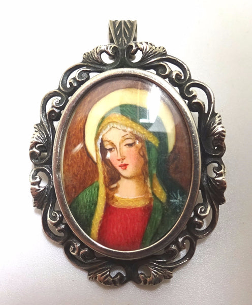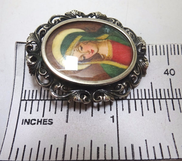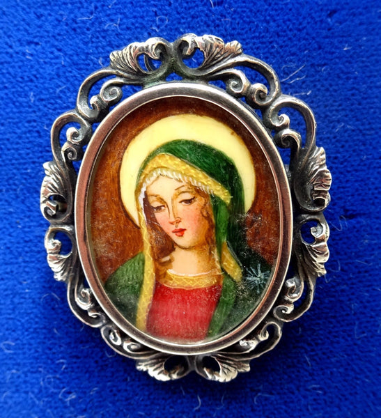 Majestic Italian .800 silver pin featuring a religious painted portrait of Madonna (Mary) surrounded by a pierced scrollwork border. The portrait measures 24.5mm x 19.1mm. The pin could also be worn as a pendant. The pin with the bail measures 1 1/2" long, it weighs 3.5 dwt., and the piece dates from the 1940-1950's. Inventory#PF3185.