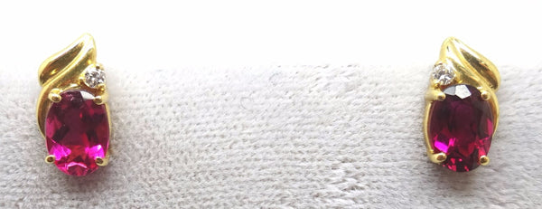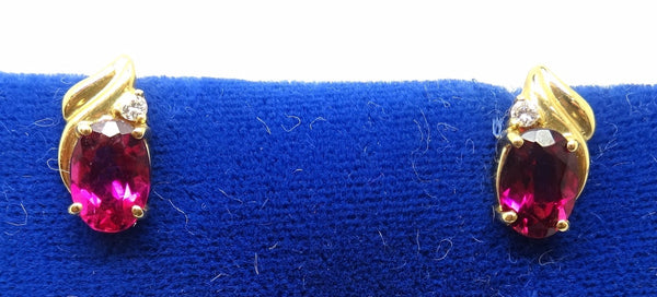 Exceptionally gorgeous 14k yellow gold earrings with post backs. Set in the earrings are beautiful rubellite tourmalines (equaling a total weight of 1.54 carats) and small round diamonds. The tourmalines measure 7.2mm x 5.0mm. The length of the earrings are 3/8" and 20mm, they each weigh 1.0 dwt., and this is a contemporary piece. Inventory#RG2302.