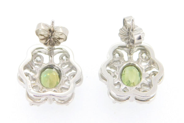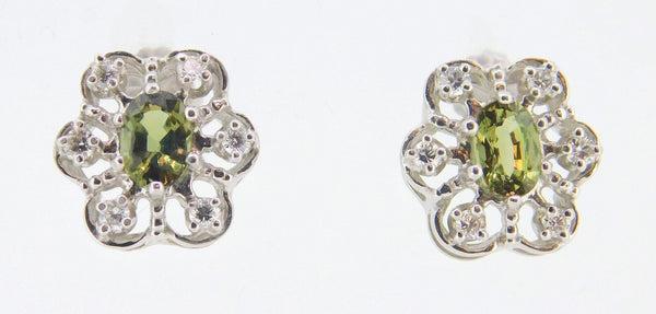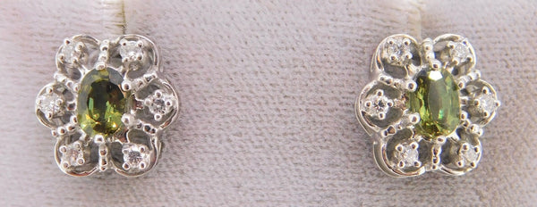 Gorgeous 14k white gold earrings with post backs. The earrings also have fabulous 1.6ct natural oval alexandrite, very rare, and they measure 7x5mm. Set in the mounting around the alexandrites are dazzling diamonds equaling a total weight of .38ct, and they each measure 2mm. The mountings measure 16x15mm, and the length of the earrings are 1/2". Each earring weighs 1.4 dwt., and this is a contemporary piece. Gorgeous!