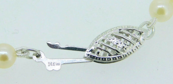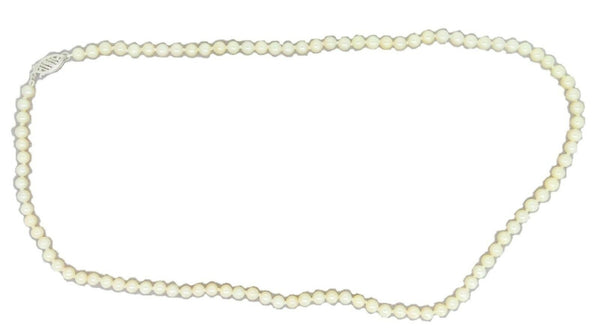 Akoya saltwater cultured pearl strand necklace with tiny rare sized 4mm-4.5mm pearls. The clasp is 14K white gold. The necklace measures 17 3/4" long, it weighs 6.7 dwt., and this is a contemporary piece. Beautiful!