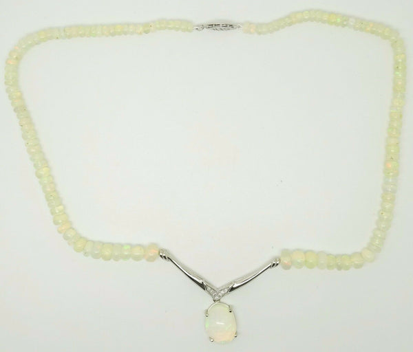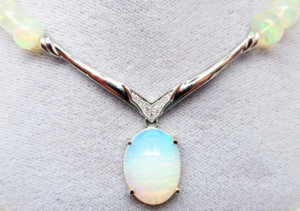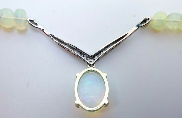 Impressive 14K white gold opal and diamond necklace. It features a stunning opal pendant with an oval opal that measures approximately 15.4mm x 11.7mm, and dazzling small round diamonds that measure 1mm. The piece also features an opal beaded necklace with opals that measure 6.6mm. It also has a 14K white gold clasp. The beaded necklace is 16 1/2" long, and from clasp to the pendant it's 8" long. The necklace weighs 9.7 dwt., and this is a contemporary piece. Inventory#NO3461.