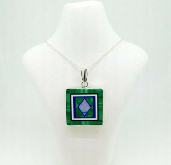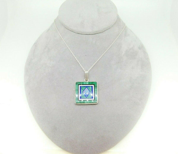 The intarsia measures about 26mm square. With the bail, the pendant measures 1 1/2" long. It includes a new 18" sterling chain. The necklace weighs 6.8 dwt., and this is a contemporary piece. Amazing!