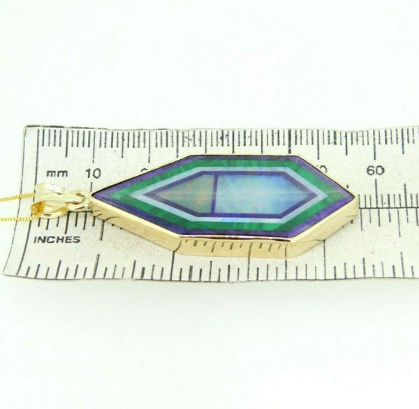 14k yellow gold intarsia pendant signed by Jim Kaufmann. The pendant features a beautiful inlay stone featuring opal, sugilite, malachite, and agate. The stone measures about 46mm x 20mm and weighs 24.8 carats.