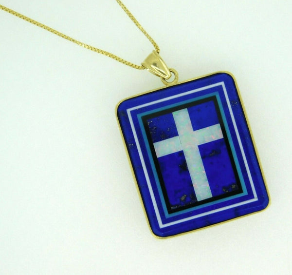 14k yellow gold intarsia pendant made with an opal cross in the center. The inlay was made with opal, lapis, turquoise, and black and white agate. The intarsia was made and signed by Jim Kaufmann and has a custom 14k bezel.