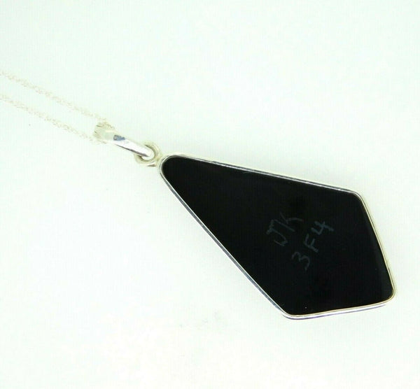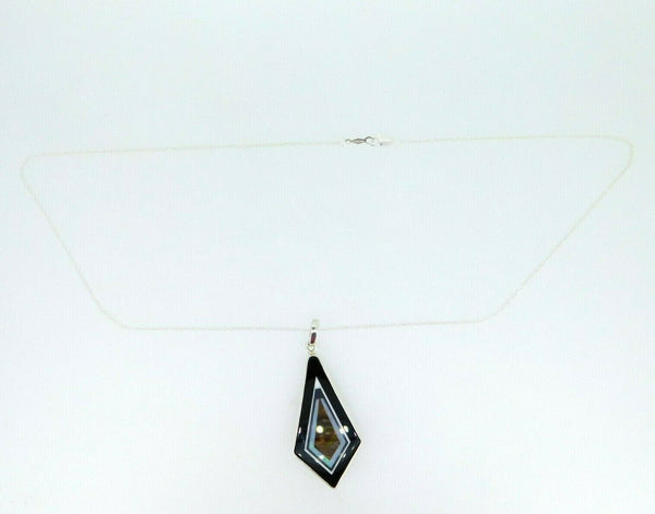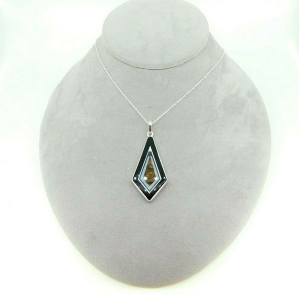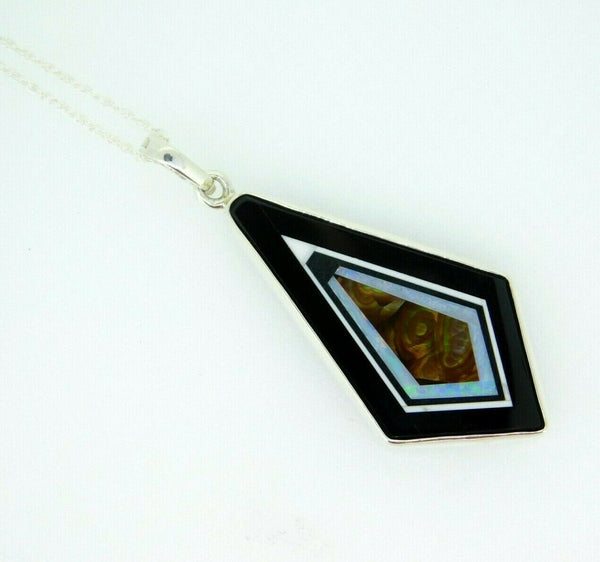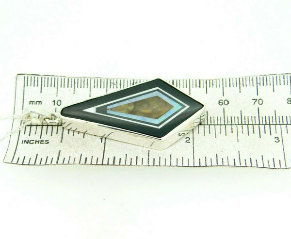 Sterling silver intarsia pendant signed by Jim Kaufmann. The pendant features a beautiful inlay stone featuring fire agate, opal, white agate, and black onyx. The stone measures about 43mm x 23mm and is bezel set.