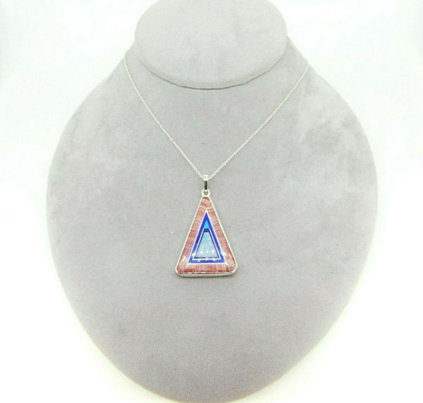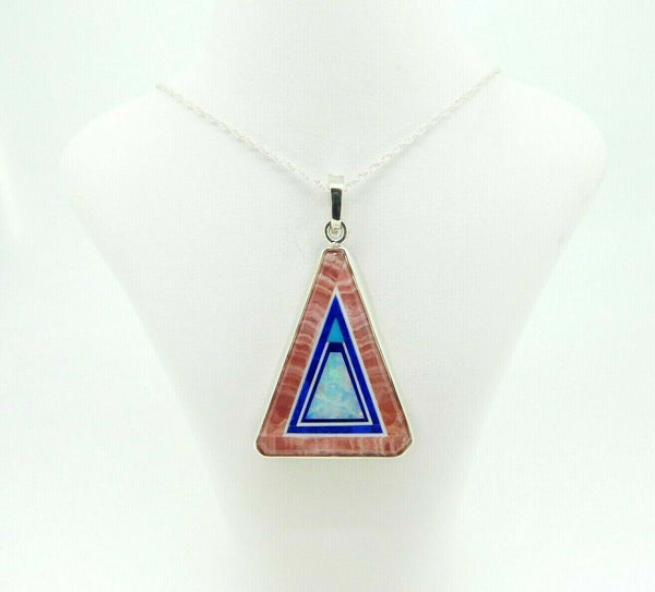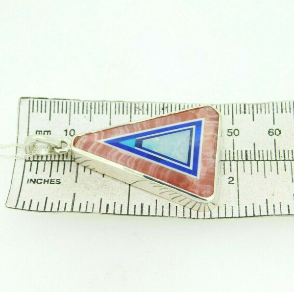Sterling silver intarsia pendant signed by Jim Kaufmann. The pendant features a beautiful inlay stone featuring rhodochrosite, opal, agate, and lapis. The stone measures about 27mm x 30mm and is bezel set.