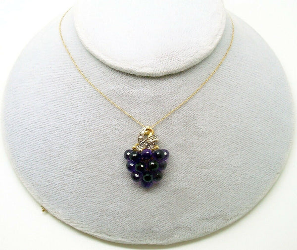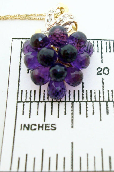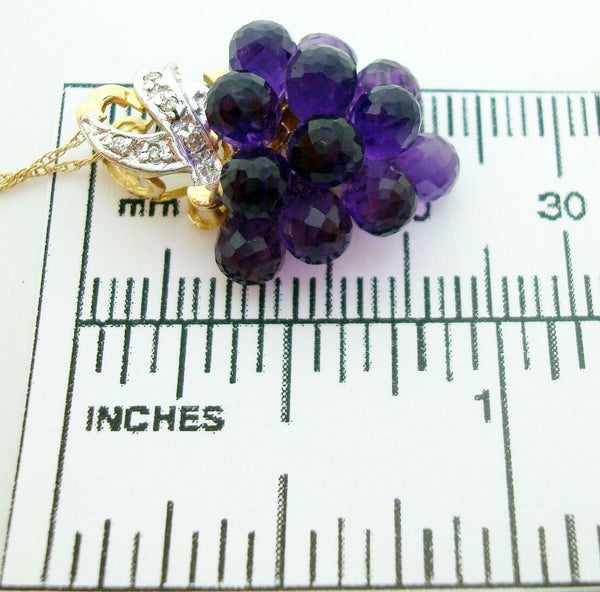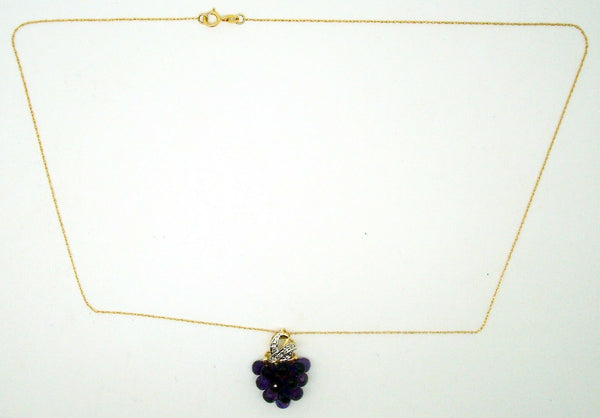 14K yellow gold pendant with briolette amethysts in the form of a cluster of grapes with diamond accents. Great deep color and 3-D! This is a contemporary piece designed and signed by Laura Ramsey. Each amethyst measures 4.2mm, and all together the pendant measures 15mm x 16.8mm. The length of the chain is 19" , the size of the pendant is 7/8" , and it weighs 2.6 dwt. Inventory#F10806. SKU#J451.
