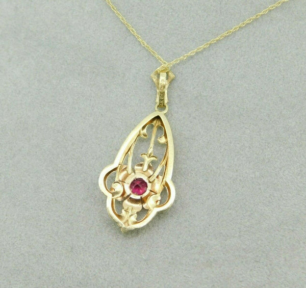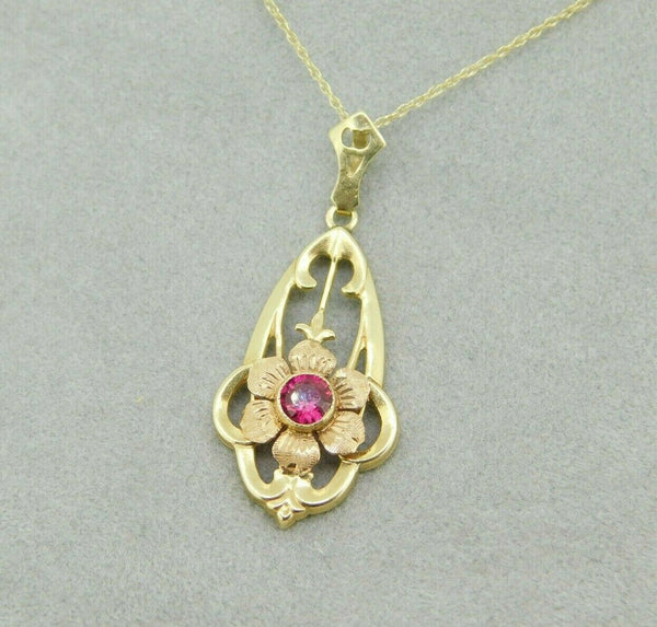 Retro 14k yellow and rose gold lavaliere pendant featuring a round synthetic ruby. The ruby is set in a rose gold flower mounting, and it measures about 5mm. The pendant measures 1 3/8" long with the bail, and it includes a new yellow gold 18" chain. The necklace weighs 1.2 dwt., and the pendant dates from the 1930's. Beautiful!