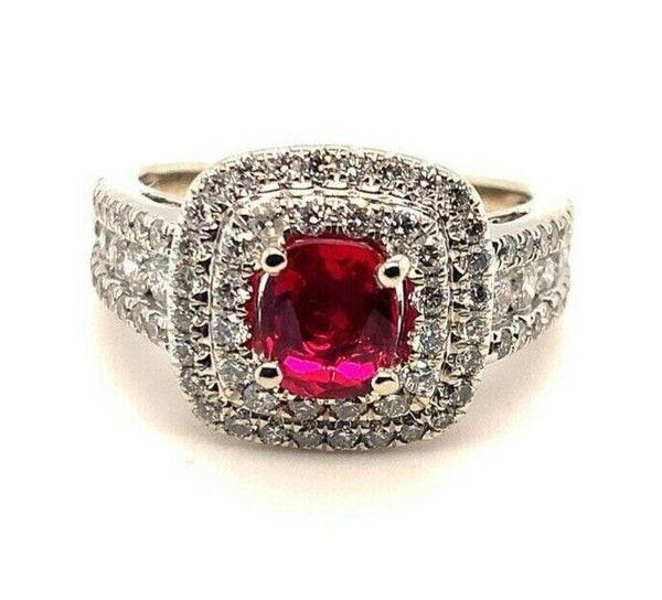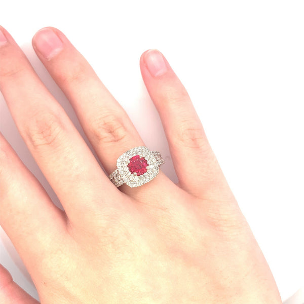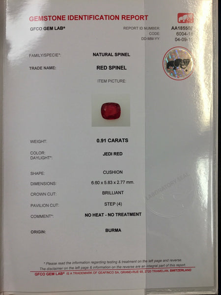 14k white gold diamond ring featuring a jedi red spinel. The red spinel weighs .91 carats and comes with a GFCO report stating Burmese and no heat. The spinel is cushion cut and measures 6.6mm x 5.8mm x 2.7mm.