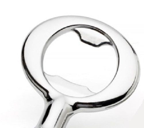 This bottle opener features long lasting chrome plating and opens traditional bottle caps.