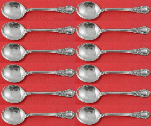 Sterling silver Cream Soup Spoon 12-piece set, 6 1/4", in the pattern American Victorian by Lunt. It is not monogrammed and is in excellent condition.