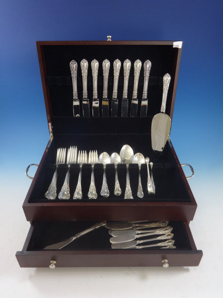 AMERICAN VICTORIAN BY LUNT sterling silver Flatware set - 47 pieces. This set includes:8 KNIVES, 8 5/8" 8 FORKS, 7 1/8" 8 SALAD FORKS, 6 3/8" 8 TEASPOONS, 5 5/8" 8 FLAT HANDLE BUTTER SPREADERS, 5 3/4" 3 SERVING SPOONS, 8 1/4" 1 SUGAR SPOON, 5 7/8" 1 HOLLOW HANDLE MASTER BUTTER KNIFE, 6 3/4" 1 CAKE SERVER W/STAINLESS BLADE, 9 3/4" 1 SUGAR TONG, 4 1/4" Includes bonus brand new storage chest - styles vary.