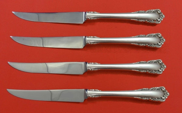 Sterling silver hollow handle with stainless serrated blade STEAK KNIFE SET 4-PIECE CUSTOM MADE 8 1/2" in the pattern CARILLON BY LUNT. It is NOT monogrammed and is in excellent condition.