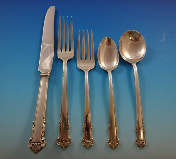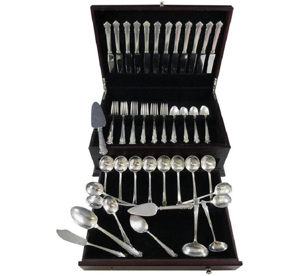 12 KNIVES, 8 7/8" 12 FORKS, 7 1/4" 12 SALAD FORKS, 6 1/4" 12 TEASPOONS, 6" 12 CREAM SOUP SPOONS, 6 1/4" 1 GRAVY LADLE, 5 7/8" 1 SERVING SPOON, 8 1/4" 1 SUGAR SPOON, 5 7/8" 1 FLAT HANDLE MASTER BUTTER, 7" 1 CAKE SERVER W/STAINLESS BLADE, 10 1/4" 1 SAUCE LADLE, 5 3/8" 1 JELLY SERVER, 6 1/4" 1 CHEESE SERVER W/STAINLESS BLADE, 6 1/2" Includes bonus brand new storage chest - styles vary.